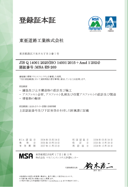 東亜道路工業グループは、社会の持続的な発展のためには、環境保護および省資源活動が重要であると認識しています。これらを事業活動における基本的な取り組みと位置づけ、以下のとおり環境基本方針を定めます。