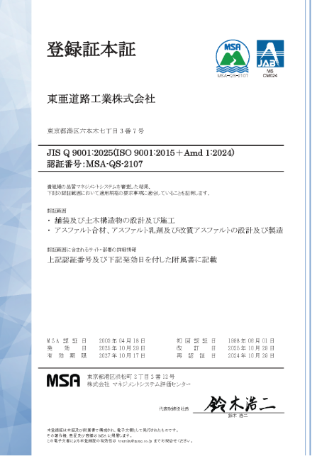 当社は、ISO9001(2015)認証を取得しており、【舗装及び土木構造物の設計及び施工並びにアスファルト乳剤及び改質アスファルトの設計及び製造】を適用範囲としています。2018年度からISO9001・ISO14001の複合審査を受けております。