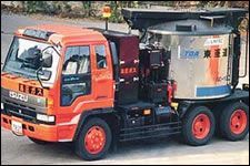 脂防水一体型アスファルト舗装は、床版上に特殊熱可塑性樹脂を多量に塗布し、基層舗設時のアスファルト混合物の熱により接着防水材を融解させ、混合物の底部に浸透させることで、床版、防水層、アスファルト混合物を一体化させる工法です。